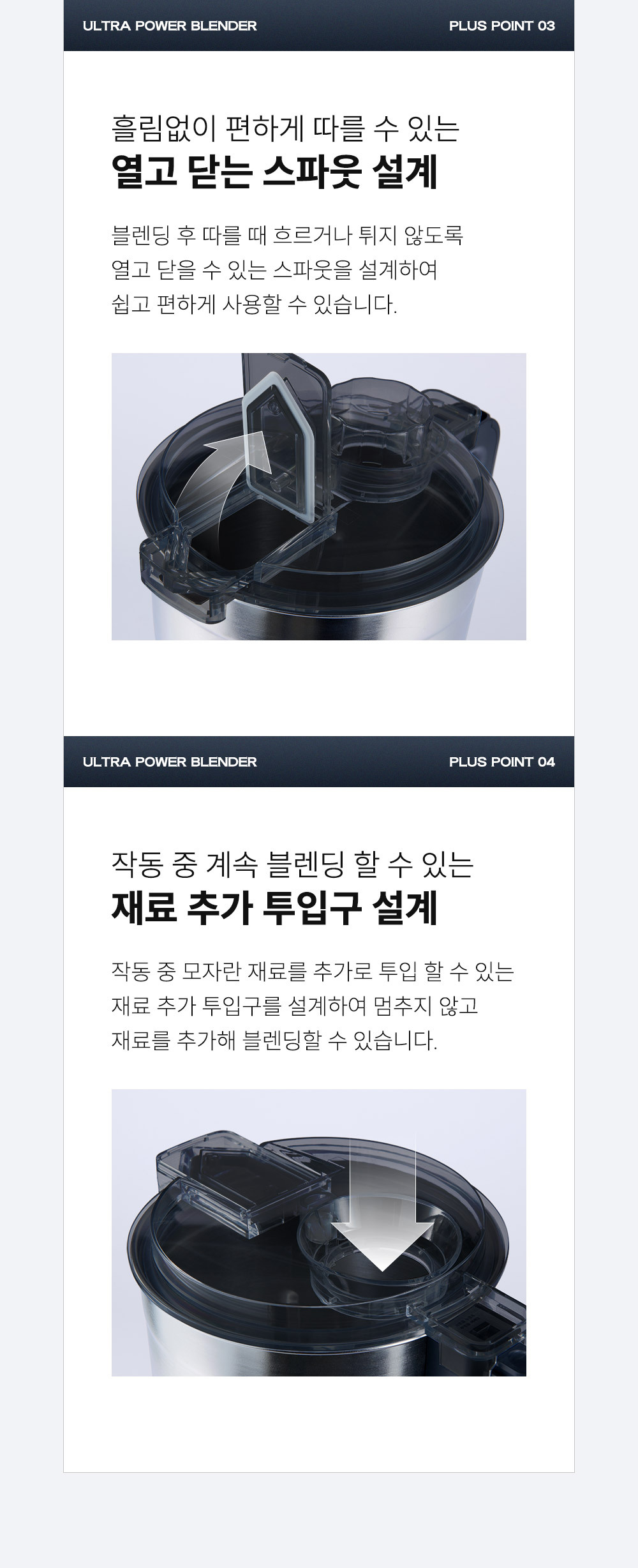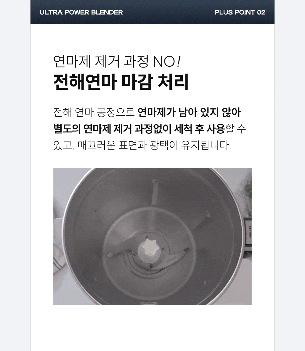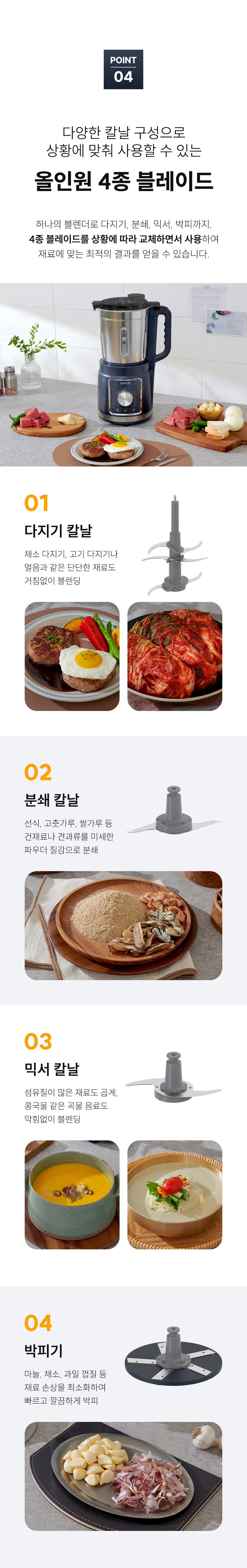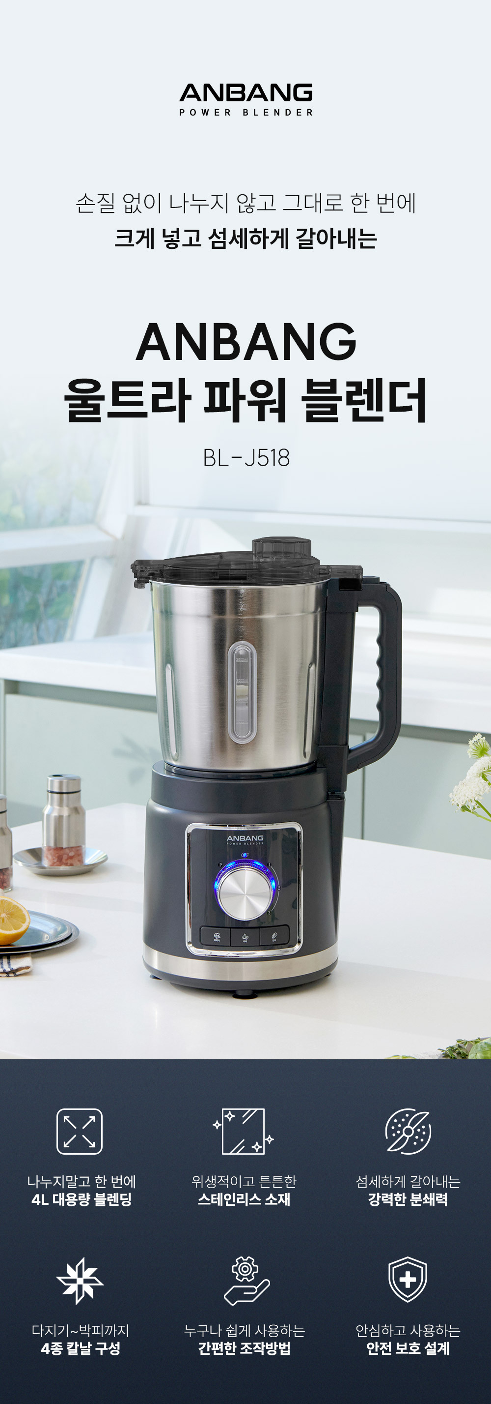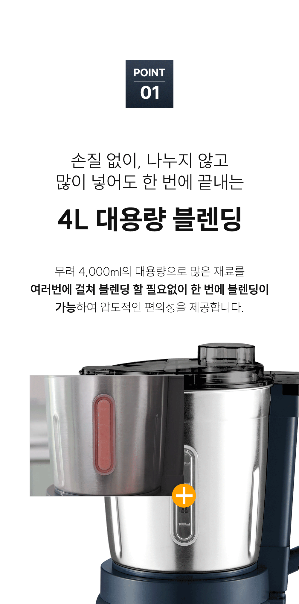 ∎ 제품특장점 :4L 대용량 블렌딩 / 위생적으로 오래 사용할 수 있는 스테인리스 컨테이너 / 전해연마 마감 처리 / 열고 닫는 스파웃 설계 / 재료 추가 투입구 설계 / 15,000RPM, 800W 울트라급 파워 성능 / 올인원 4종 블레이드 / 직관적인 사용 방식 / 안전 설계 시스템