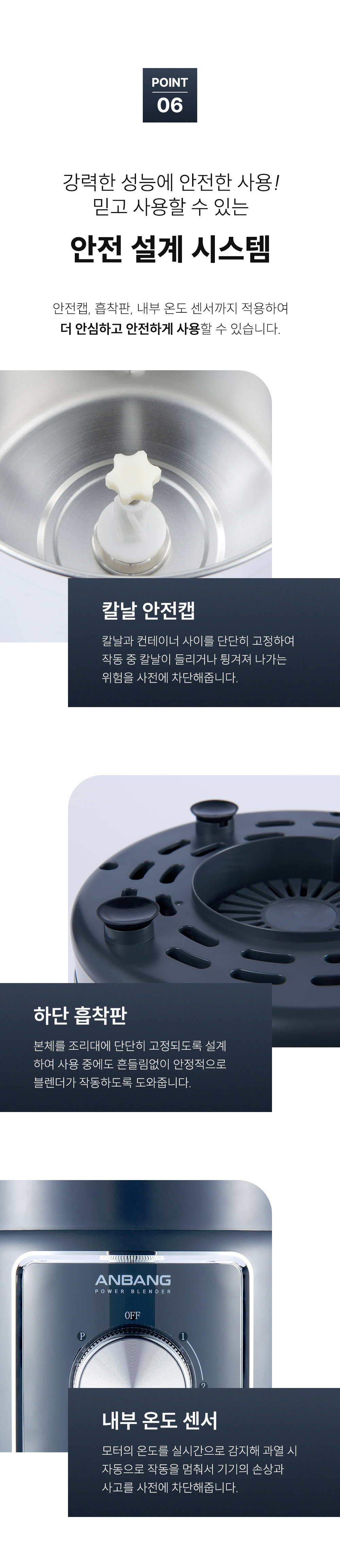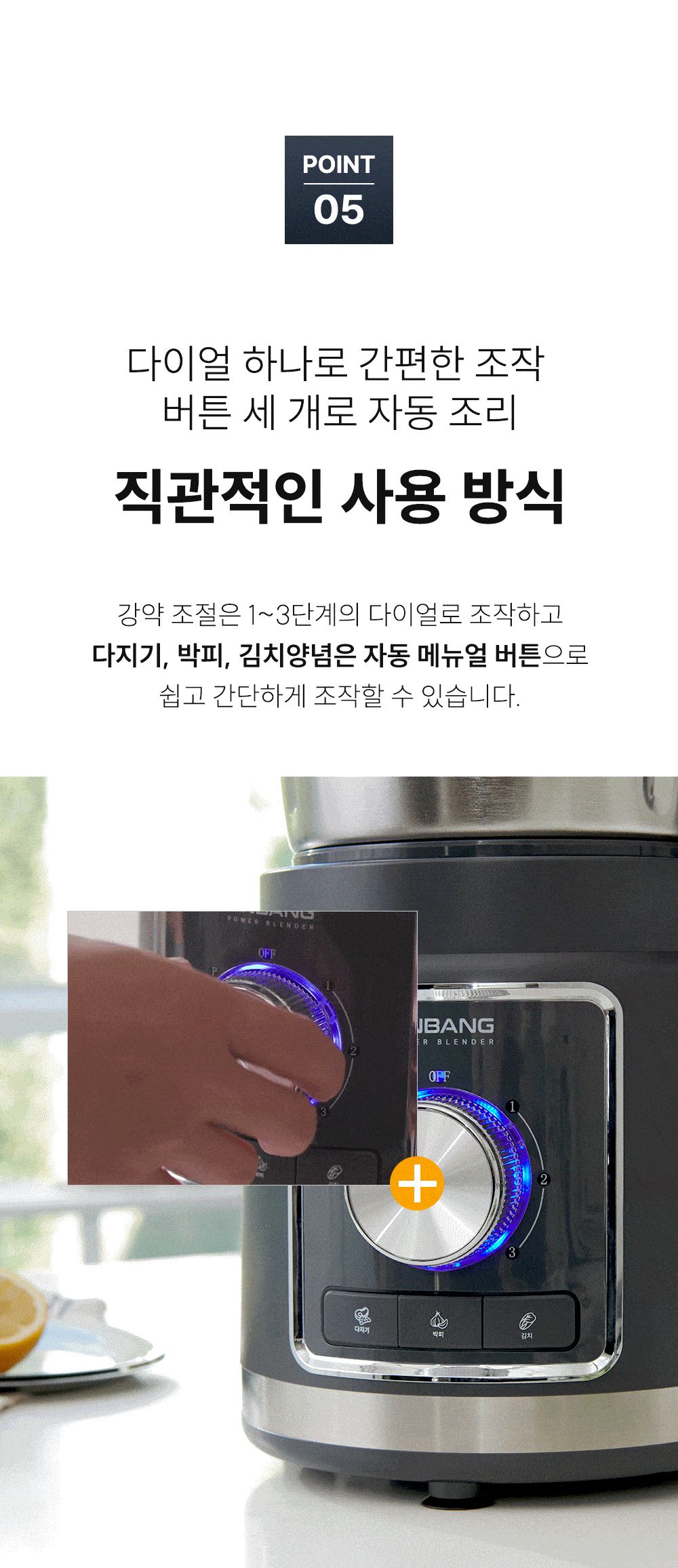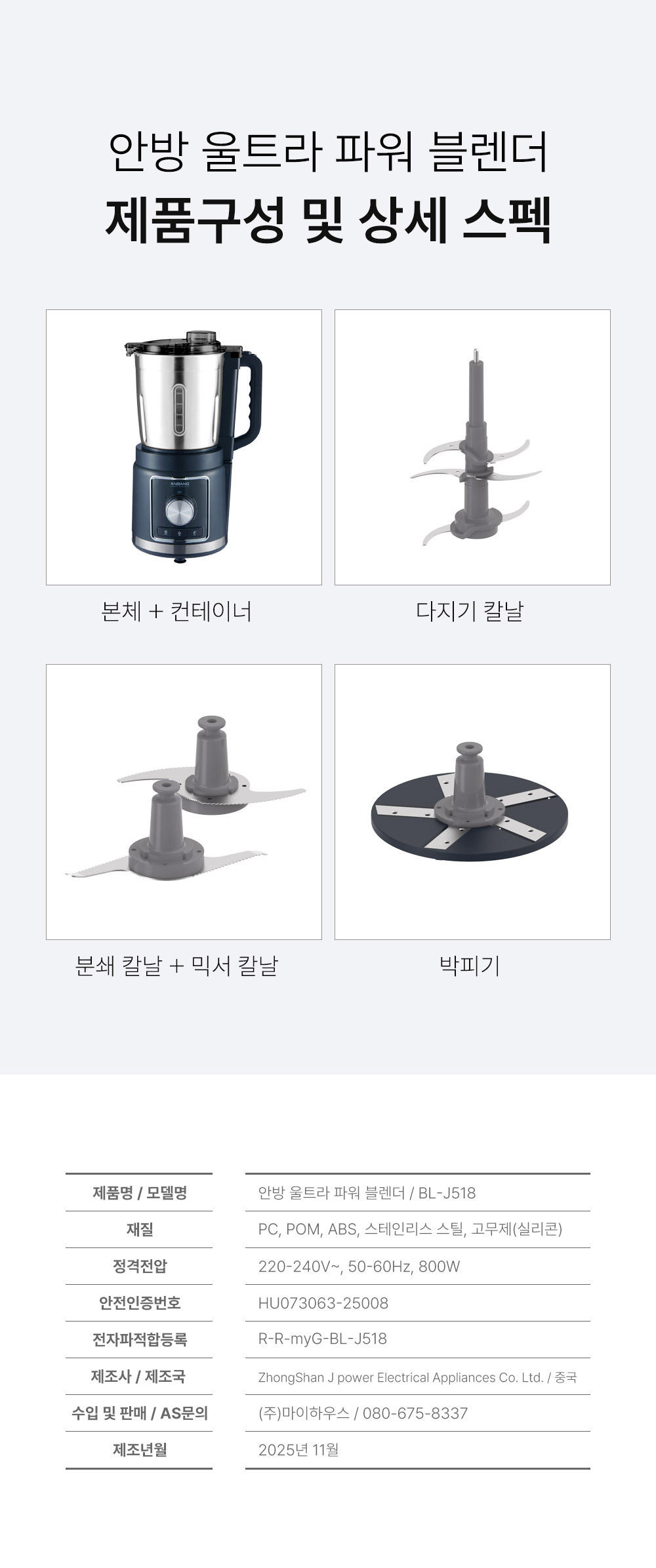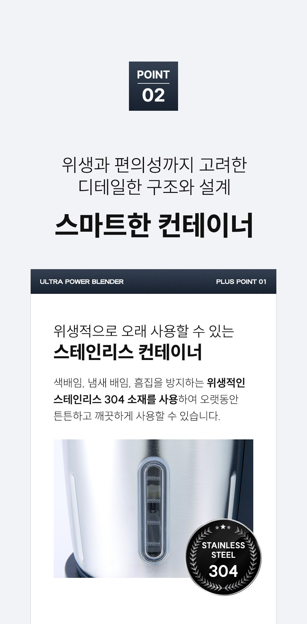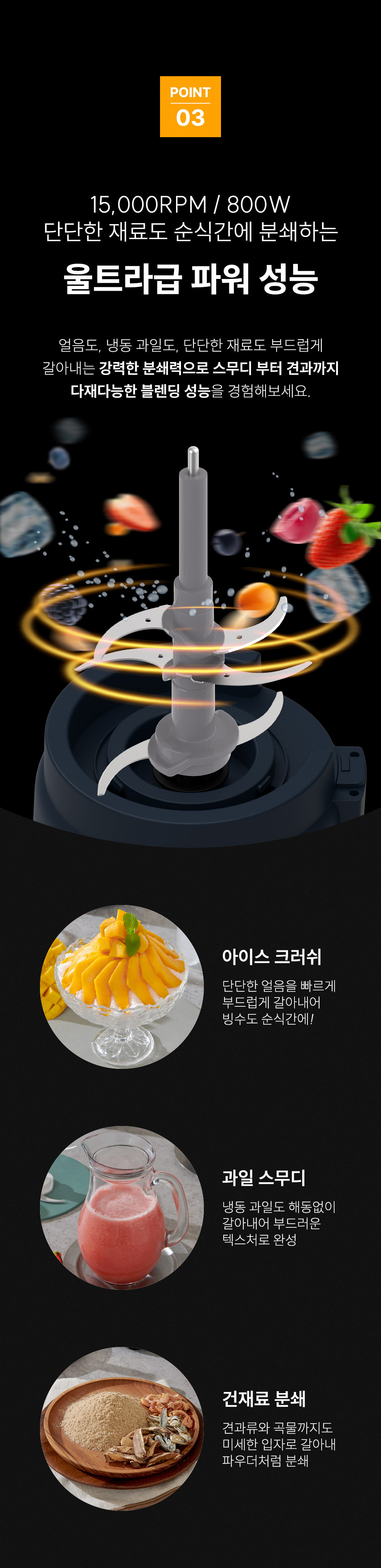 ∎ 제품특장점 :4L 대용량 블렌딩 / 위생적으로 오래 사용할 수 있는 스테인리스 컨테이너 / 전해연마 마감 처리 / 열고 닫는 스파웃 설계 / 재료 추가 투입구 설계 / 15,000RPM, 800W 울트라급 파워 성능 / 올인원 4종 블레이드 / 직관적인 사용 방식 / 안전 설계 시스템